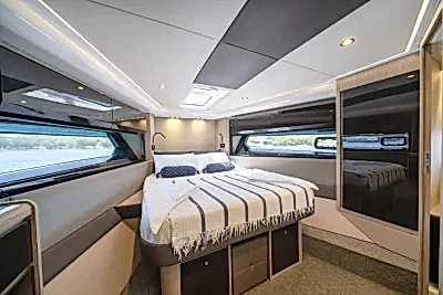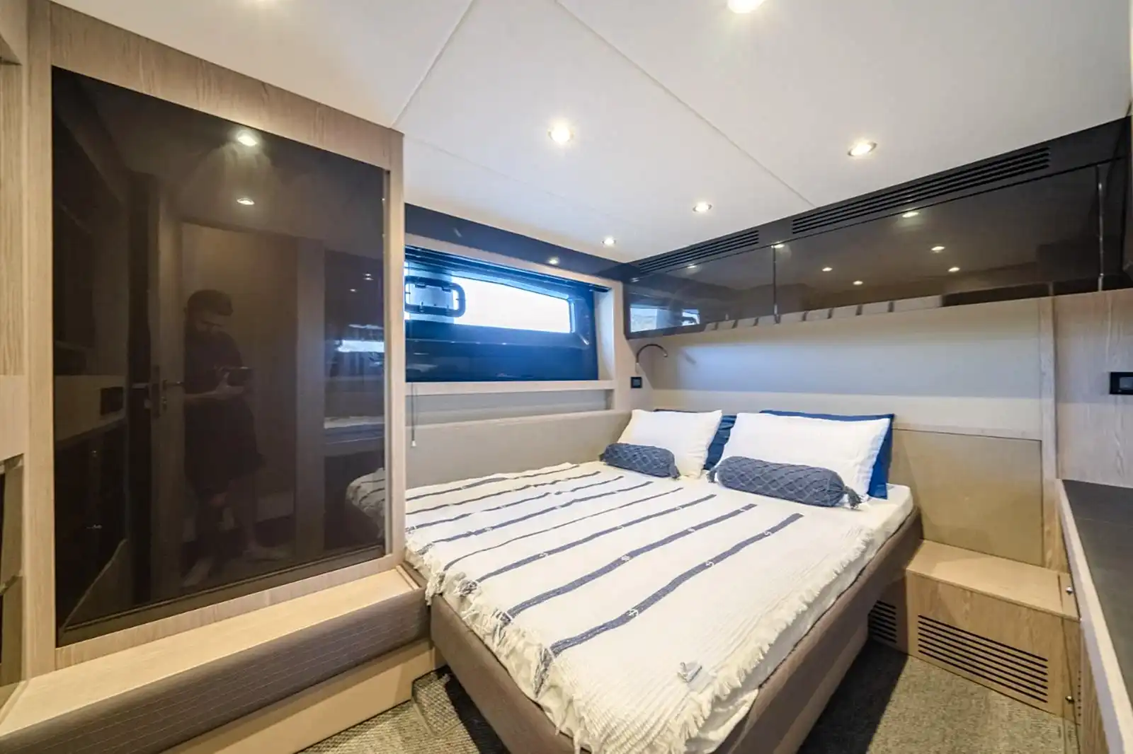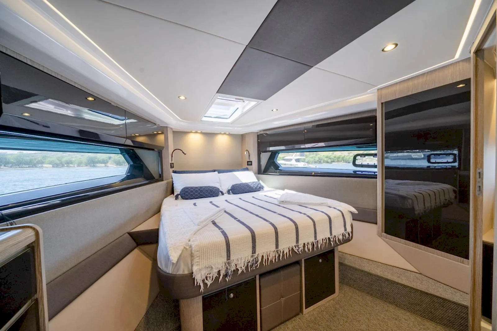 Toplamda yaklaşık 16 metre uzunluğundaki bu zarif yat, minimal detaylarla maksimum rahatlık sunar. Açık alanları kadar iç yaşam bölümleri de akıllıca planlanmış olup, kabinler gerektiğinde dinlenme alanı olarak kullanılabilir. Duş, giyinme bölümü ve tuvalet gibi pratik donanımlar, deniz üzerinde tam bir konfor sağlar.