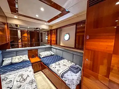 Günlük özel turların yanında, 4 kabini bulunan teknemiz 8 kişilik misafir grubu için kusursuz rahatlık sunan bir mavi yolculuk sunmaktadır. Bodrum özel yat turu için lüks ve konforlu yatımızda lüks bir tatil yaşacaksınız. Denizin rahatlatıcı atmosferinde, güneşin keyfini çıkarırken, doğal ada ve koy manzaraları eşliğinde unutulmaz anlar yaşayabileceksiniz. Gün batımı programlarımız da ise romantik, sakin ve harikulade bir atmosfer sunarak, siz misafirlerimiz için göz alıcı bir ortam sağlamaktadır.